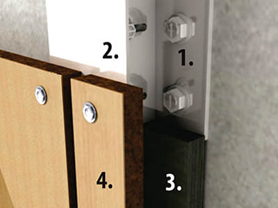 Devido à sua composição e modulação, o HPL Pertech Exterior é ideal para a instalação de fachadas ventiladas que necessitam de isolamento térmico para atender ao projeto. Atuando como uma pele flutuante no fechamento do edifício, ele cria uma câmara posterior que permite a instalação dos seguintes componentes: (1. Acessório de fixação, 2. Perfil vertical, 3. Isolante e 4. HPL Pertech Exterior).